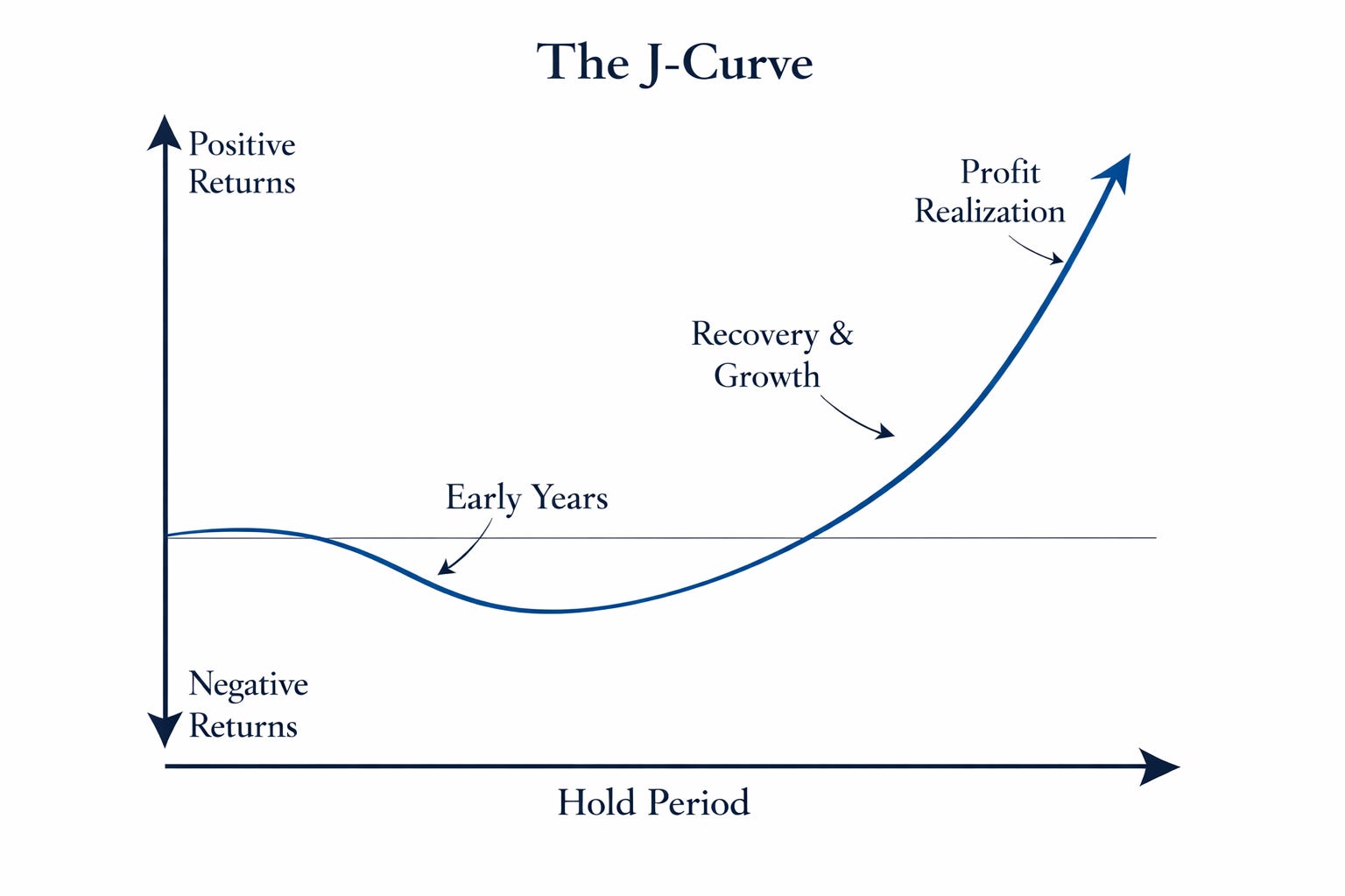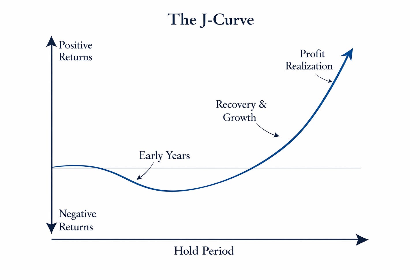 Private funds, particularly in venture, tend to follow a J shaped return curve: capital is deployed early, fees accrue, and real value creation takes time to show up in marks and liquidity. That is not a flaw; it is the time geometry of private markets.
